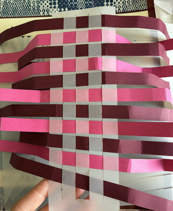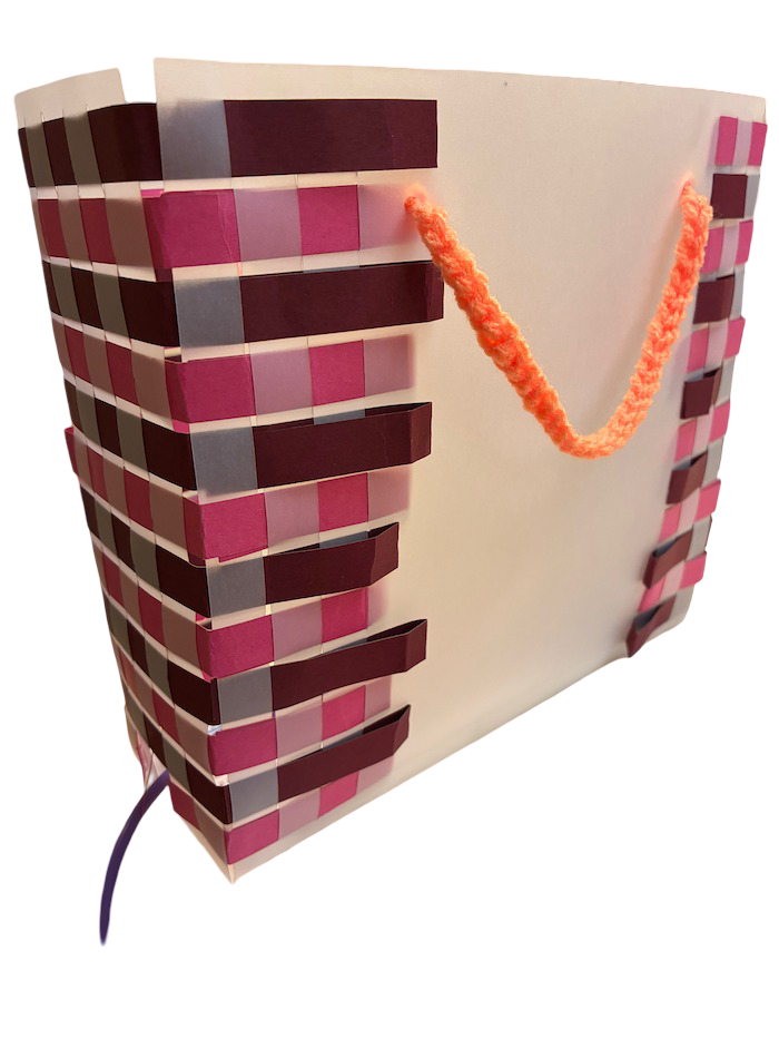 I started weaving the cardstock strips on the sides first and weaving those strips on the front and back pieces of the tote.
