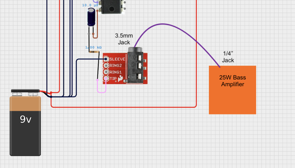 I will be using my 25W bass amplifier to amplify the sound. So I had to modify my circuit to accomodate for this.