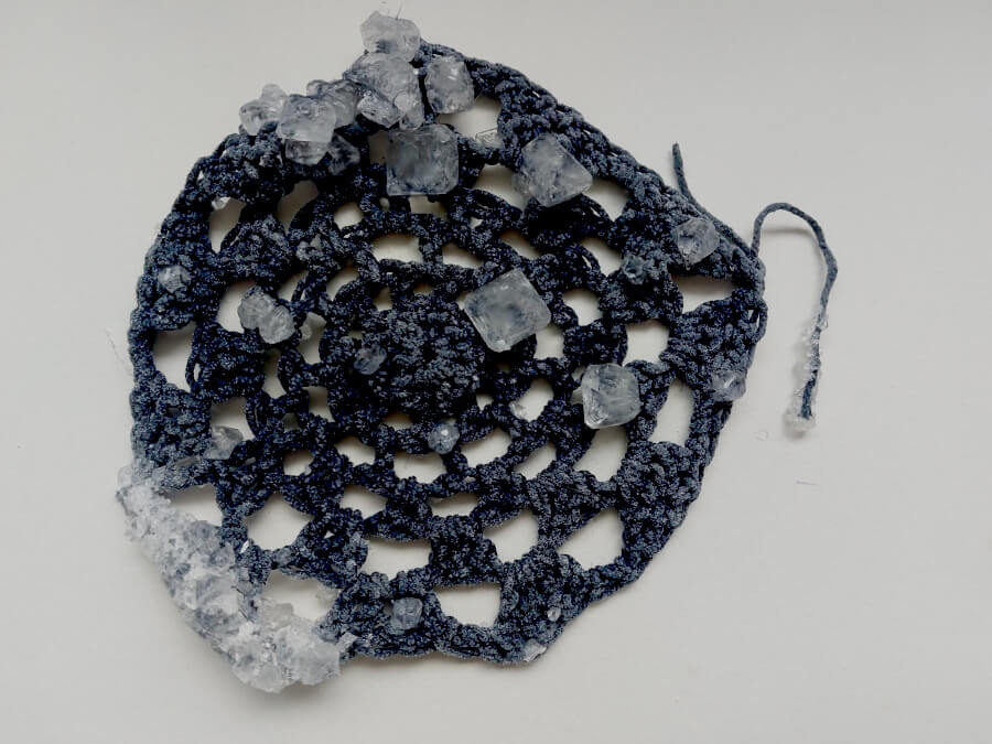 Later, since I still had some solution left, I tested crystallization on a blue yarn that I had crocheted into a small, doily-like shape (similar to the ones at my parents’ home). The crystals were still forming but remained quite few, so I heated the solution again and replicated the process in a small jar.