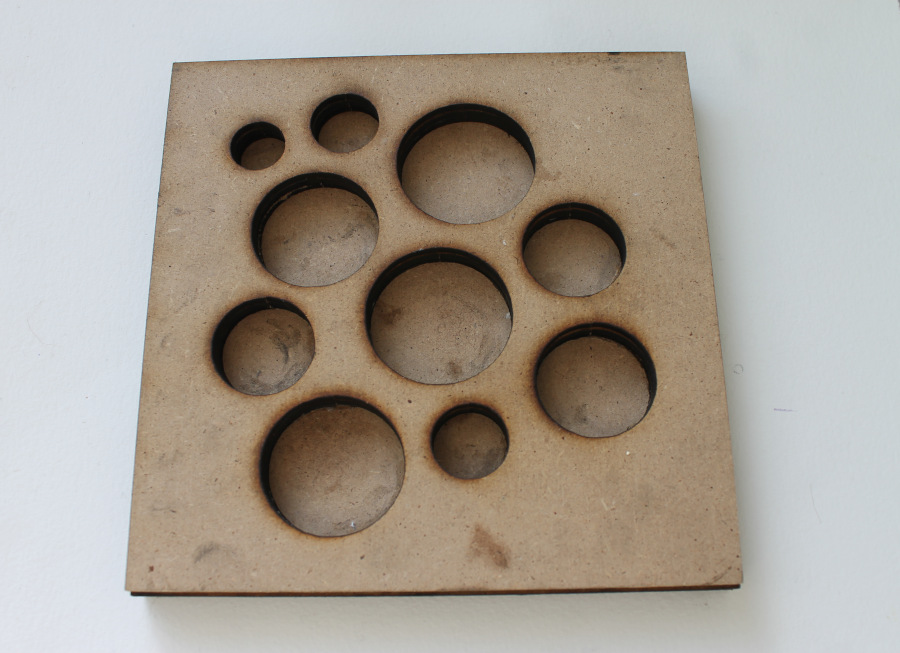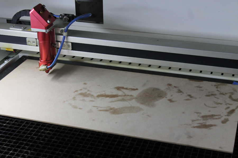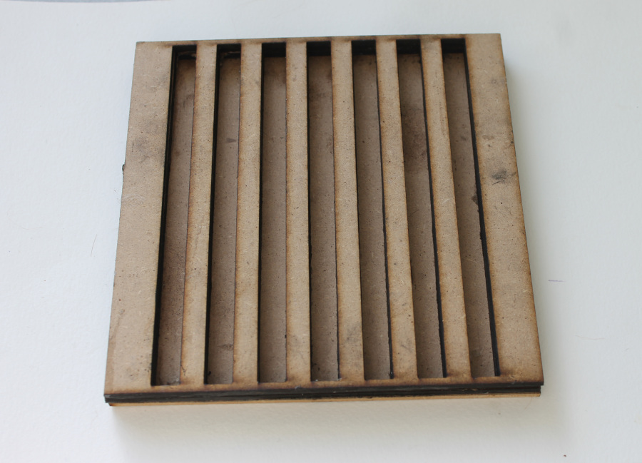 I created two shapes on a square base, using a leftover MDF panel marked by traces of earlier projects. MDF (medium-density fiberboard) is made of wood fibers and glue, not the most sustainable material but still suitable for laser cutting. Each piece was sized to 60 × 30 cm, with a thickness of 3 mm.