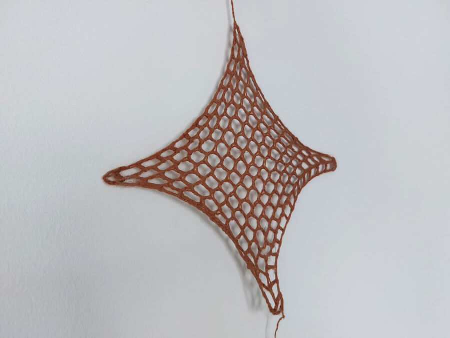 I began exploring the use of wool as a formwork material for casting. I ran a first test by crocheting a small structure and applying the alginate bioplastic process. Now that the piece has hardened, the next step is to embed it in plaster and cast a new form from it.