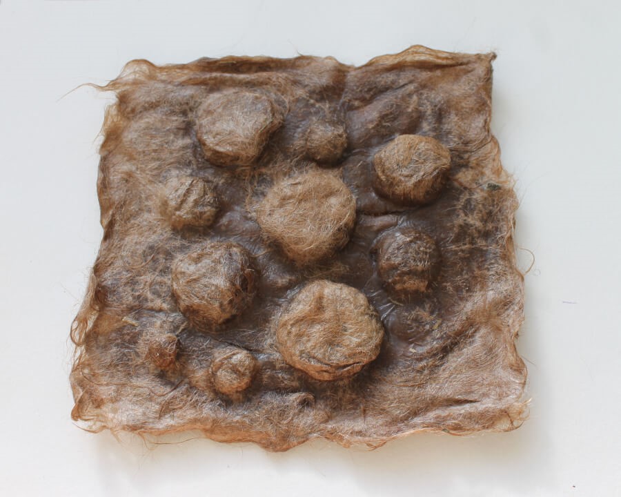 Curious to explore a softer bio-composite using a different wool, I proceeded with unwashed llama wool in natural beige tones, using starch as the primary binder.