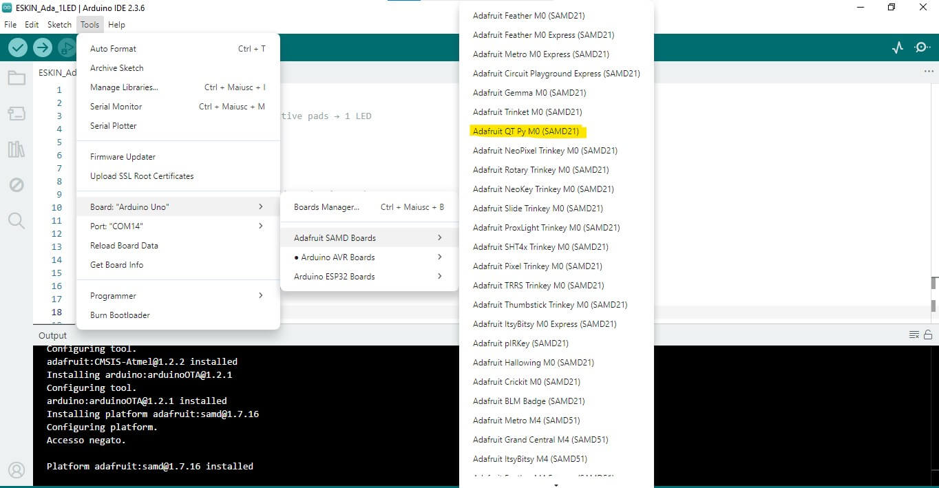 Select the QT Py board. Go to Tools > Board, scroll to Adafruit SAMD (32-bit ARM Cortex-M0+) Boards, and select: “Adafruit QT Py M0” (or your specific QT Py version, e.g., QT Py ESP32-S2, QT Py RP2040, etc.).