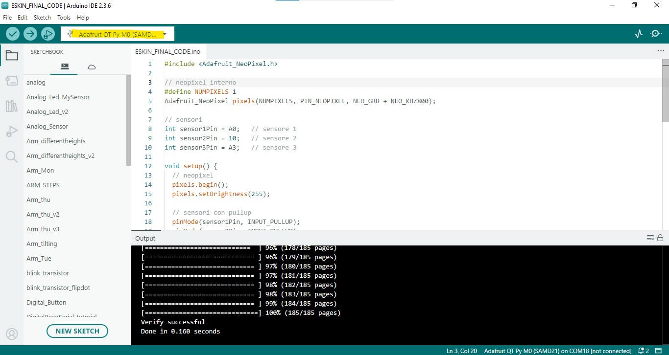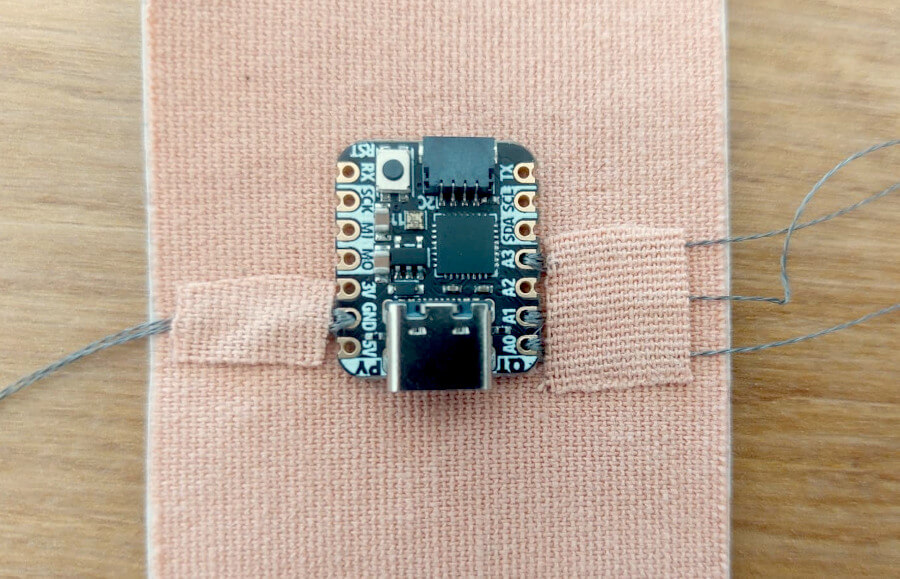 I was looking for a smaller solution and in the lab I found Adafruit SADMI (QT PY). While activating this small microcontroller I found a neopixel already embedded, tested it and decided to use it instead of sewable LEDs in order to reduce the number of components.