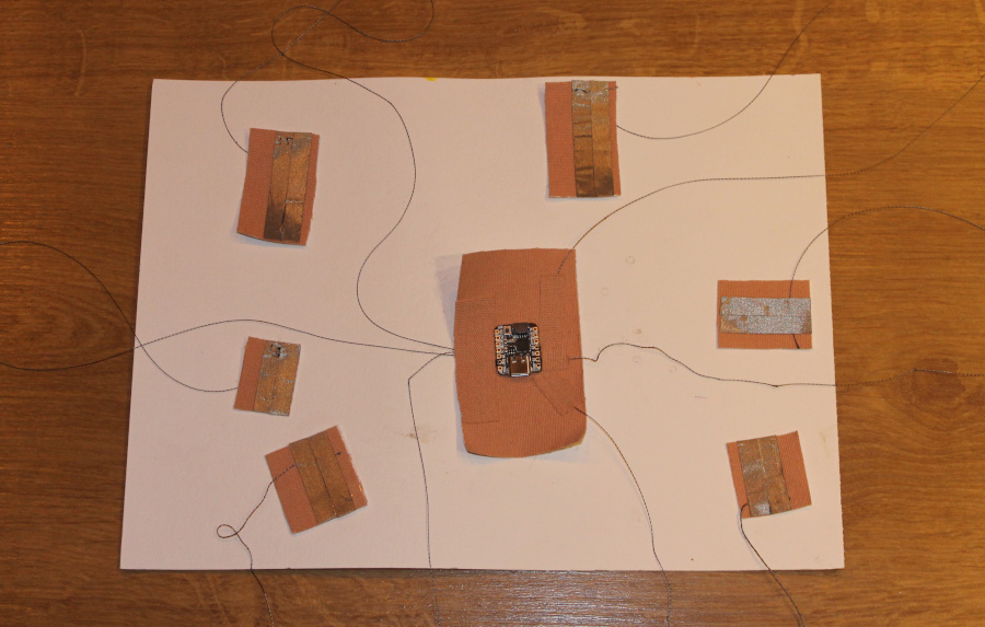 Note: During later iterations, I improved the insulation between the conductive threads connected to the positive pins to prevent false contacts, by adding an extra layer of kinesio tape.