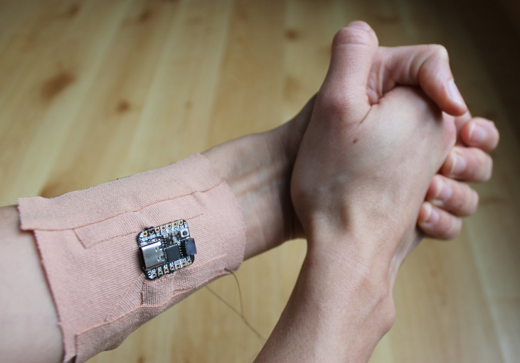 As a result, I developed a wearable prototype consisting of three contact-based sensors integrated on kinesio strips, connected to an Adafruit microcontroller with an embedded NeoPixel to provide visual feedback.