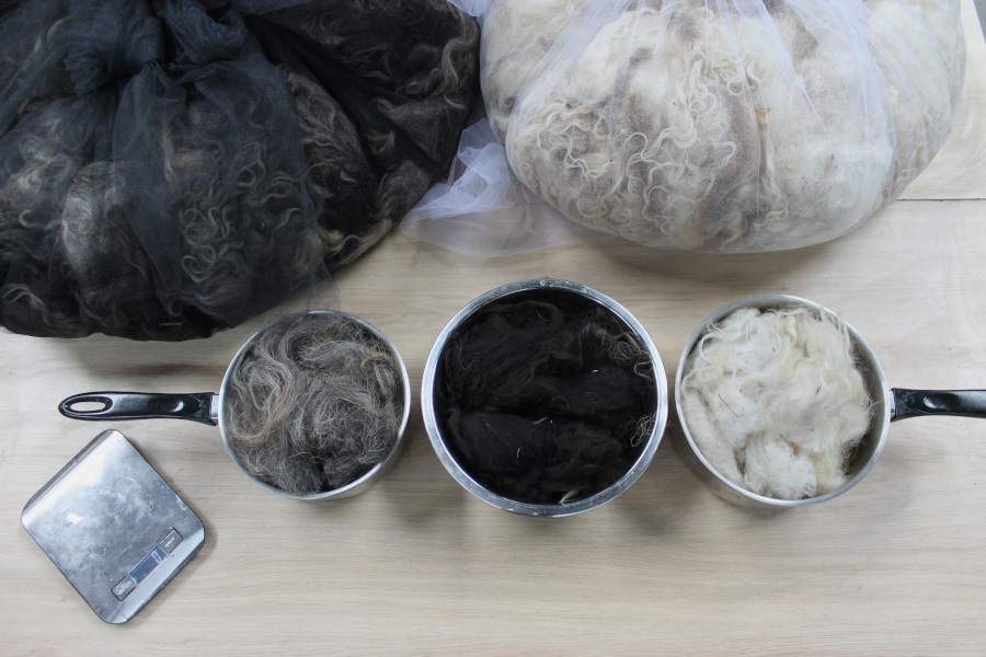Quantity: 50 g of raw wool and 500 ml of water per batch, for three rustic wool colours: beige, dark, and mélange. Each batch was placed directly into stainless steel bain-marie containers.