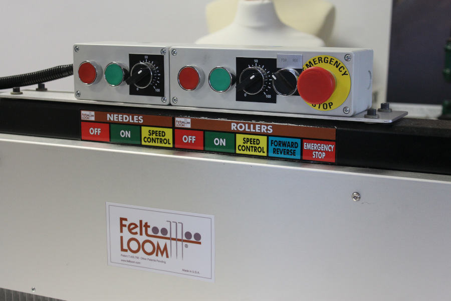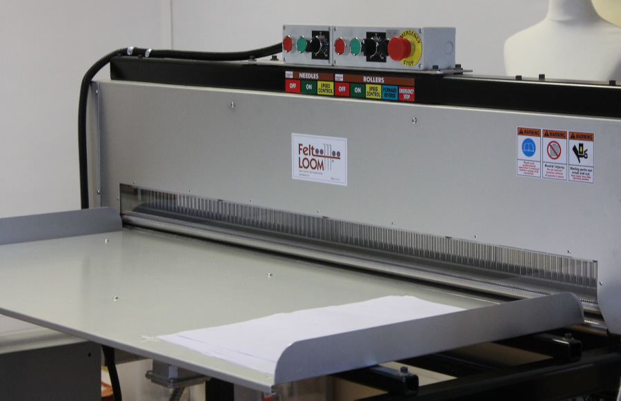 The FeltLOOM is a needle-felting textile machine that compacts wool fibers through a dry mechanical process. Material is placed on the feed side and drawn forward by rollers toward rows of barbed needles.