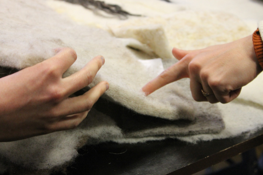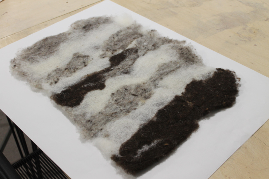 I created a felting piece by combining two layers of different wools (Thônes et Marthod, Noir de Velay and mélange fibers) and running them through the felting machine four times.