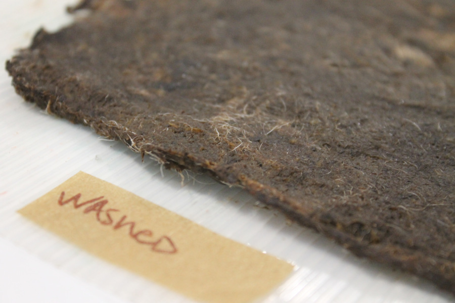 Unwashed wool appears to bond less effectively with the binder compared to washed wool.