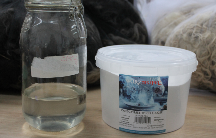 Add wool and binder: add the wool fibers and the CMC, stirring slowly to ensure even distribution.