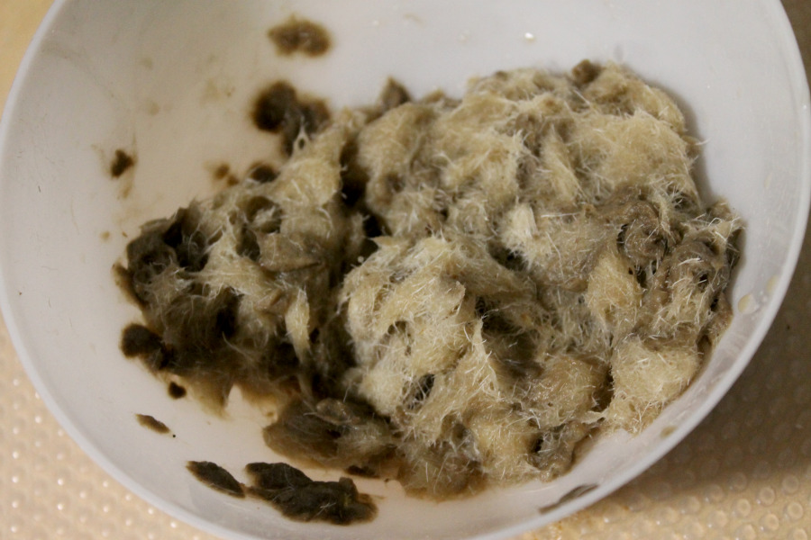 Combine fibers: in a bowl, mix wool with CMC solution and incorporate water.
