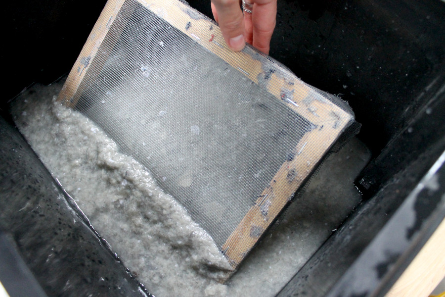 Prepare the vat: fill a large container with water and add the paper pulp, mixing gently.