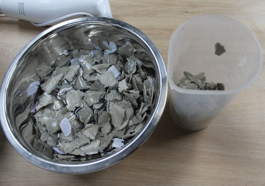 Prepare paper pulp: tear paper into small pieces, soak in warm water for 10–15 minutes and mash by hand until a fibrous pulp forms.