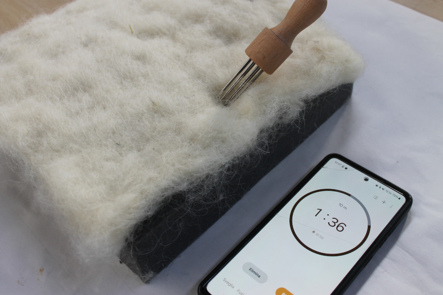 - Continue alternating sides, gradually increasing the density of the felt by repeating the needling motion across the surface and along the edges.