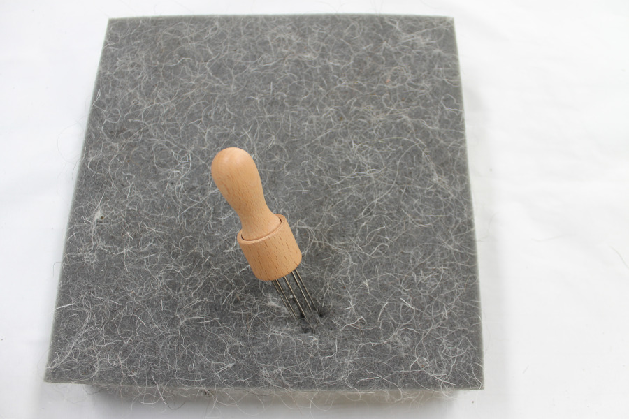 A first test was conducted with carded wool placed on a felting mat and felted as a layered square. The tool was used on the first side and then the process repeated on the other side.