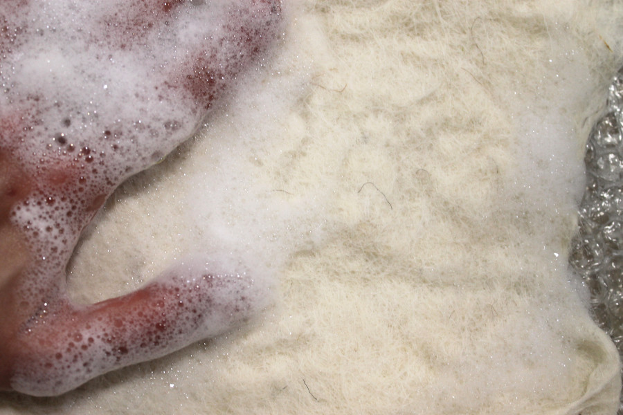 - Massage the wool using warm water and Marseille soap, working the fibers in multiple directions.