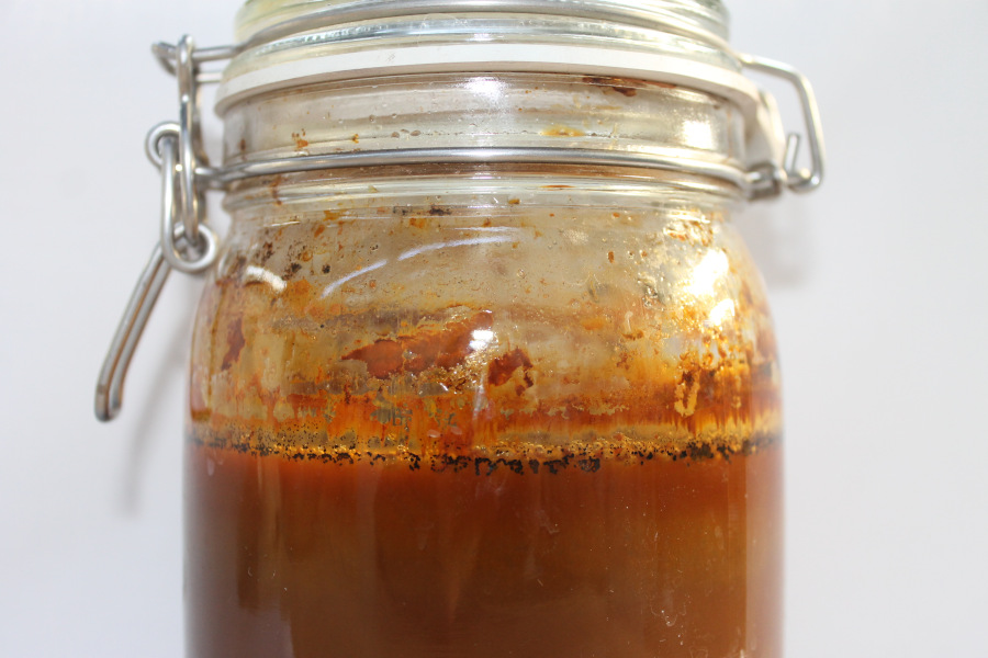 Dyeing: pour the hot coffee dye bath over the wool, fully submerging the fibers and close the jar with a lid. Leave the wool immersed in the dye bath at room temperature for at least 60mins (I kept overnight) with no further heating.