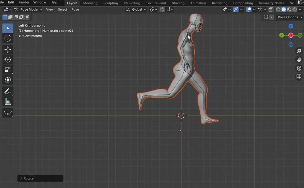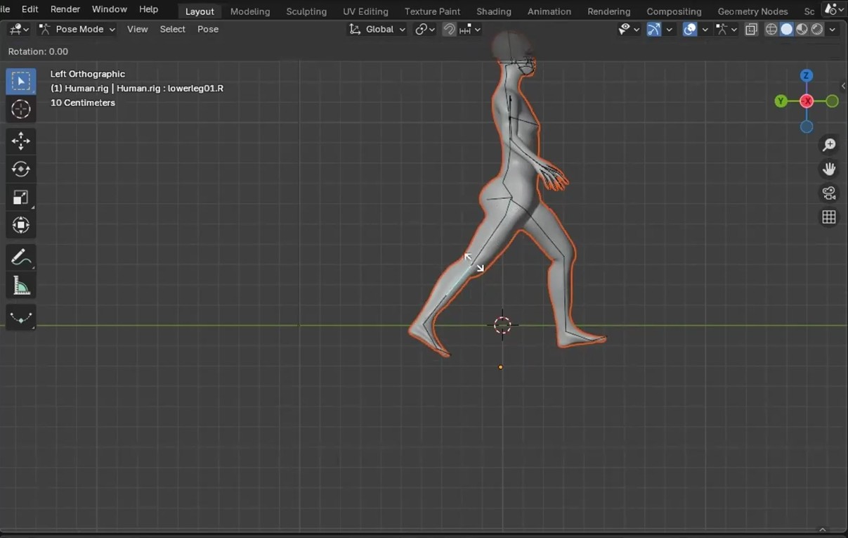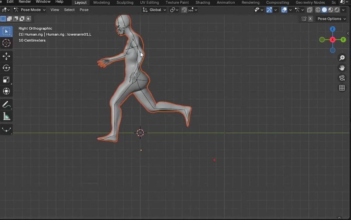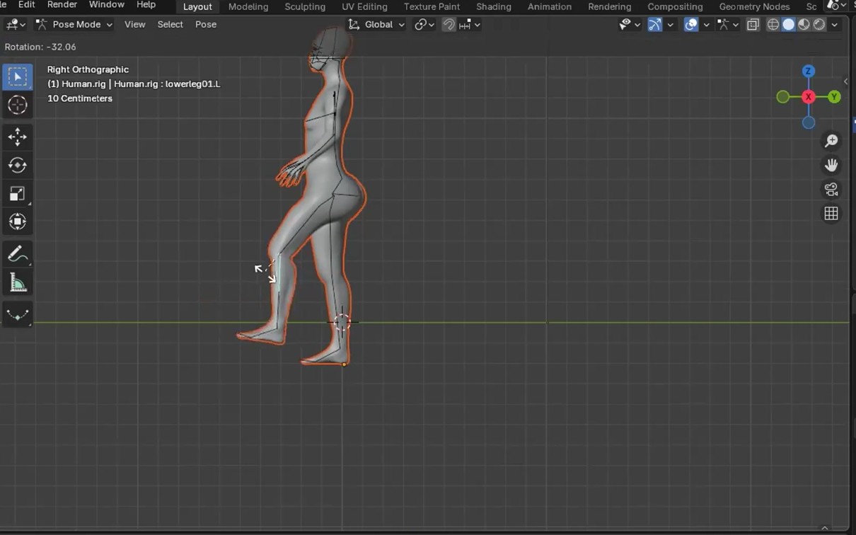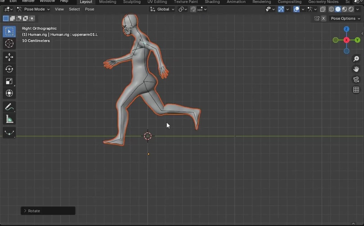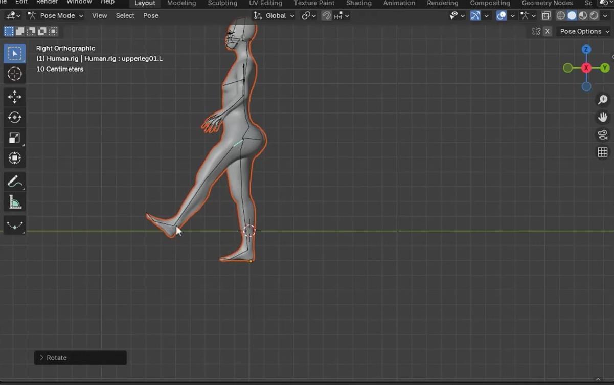 I further tried to do body movements by changing from edit mode to pose mode. Clicking on specific rig to make adjustments, I made my human to kinda float.