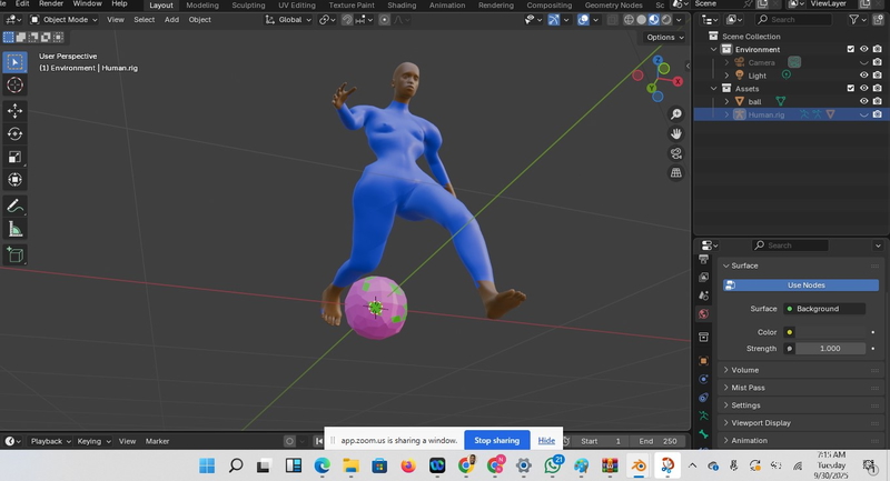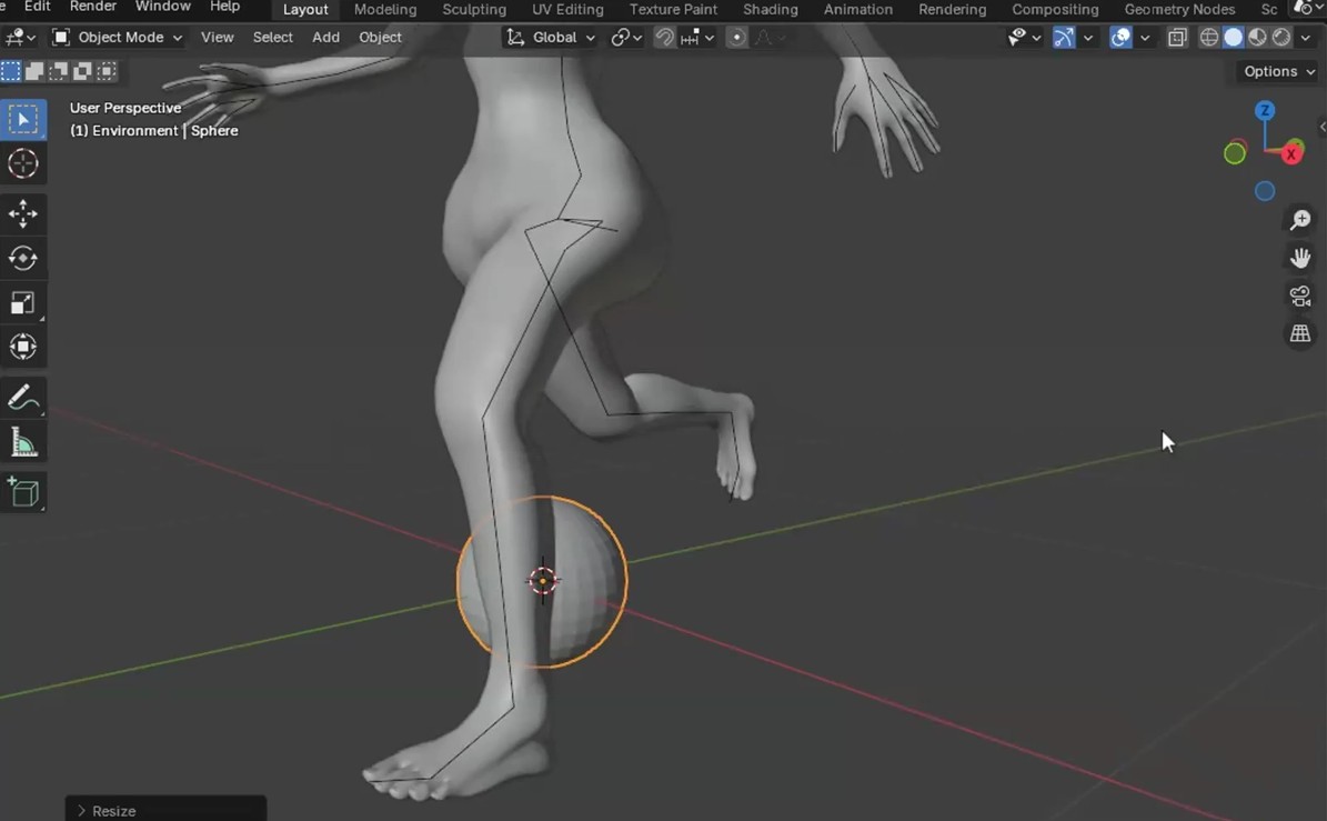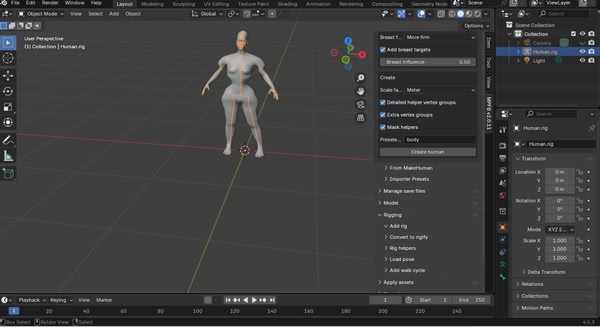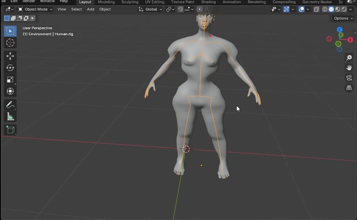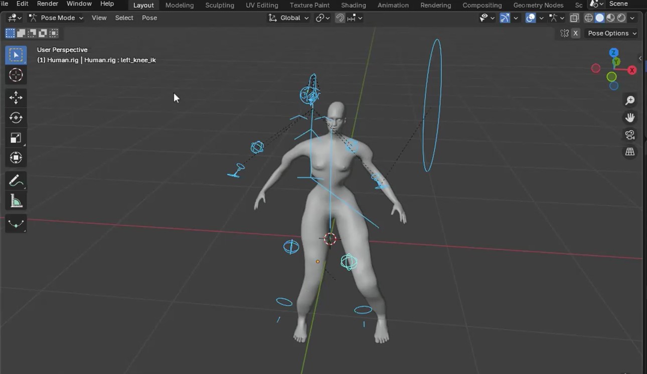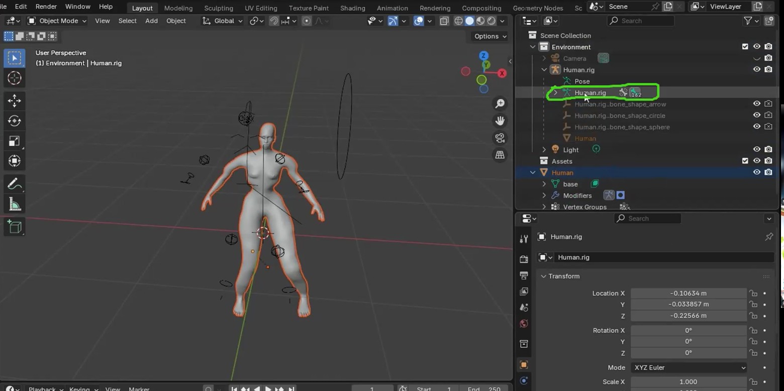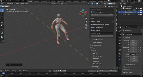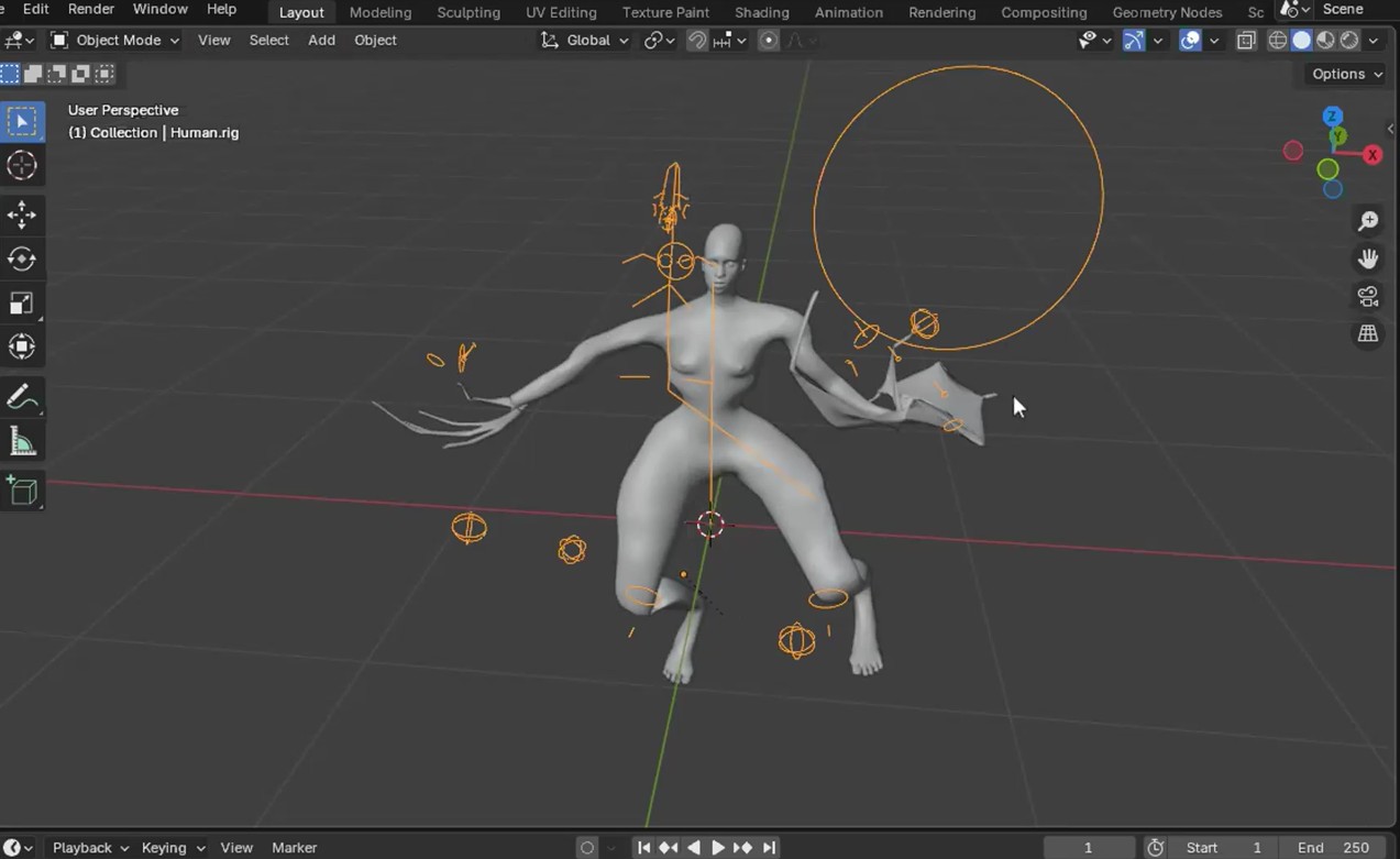 I further tried to do body movements by changing from edit mode to pose mode. Clicking on specific rig to make adjustments, I made my human to kinda float.