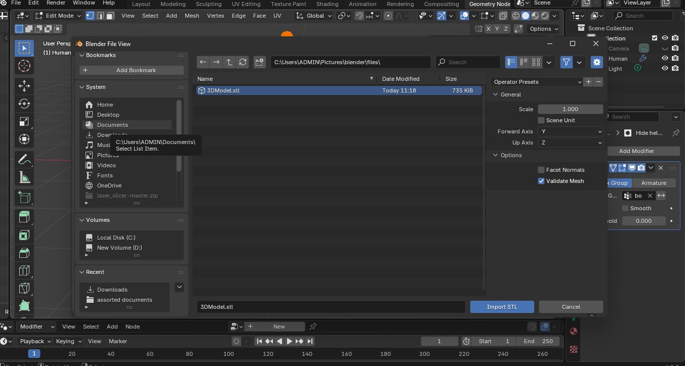 I went back to edit mode, In File tab, I exported my file as STL which I later sliced using my prusa slicer that I already installed for 3-D printing.