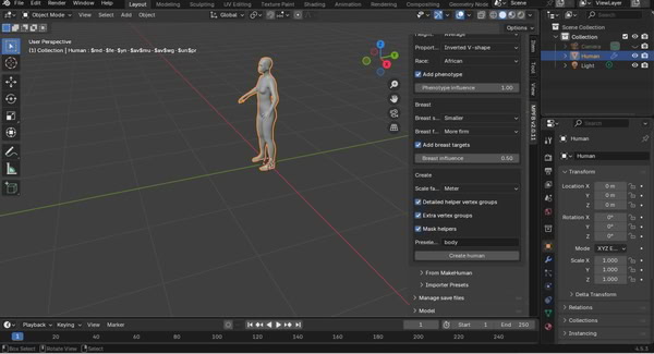 - With now my MakeHuman in Blender, I could create a human with feature preferences such as gender, age, race.. To access the MPFB, I clicked the N key which popped some command tools that helped me change the human model to my preference.