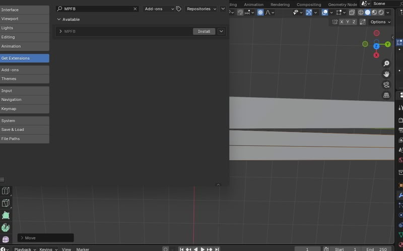 3. In edit under blender app, select preferences-go to get extensions then search MPFB, then then click install.