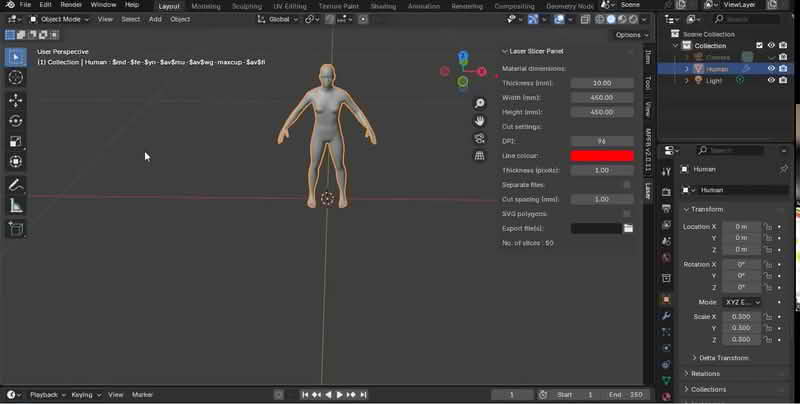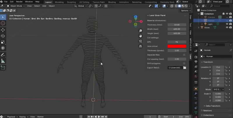 I used laser slicer add-on in blender to slice my human. I transferred it as an svg file to inkscape.