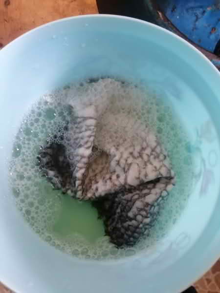 In 450ml water, I added 5 tbsp of white vinegar together with 1 tbsp of salt and submerged the skin 2-3hrs while stirring occasionally to prepare for tannin. This was the end result.