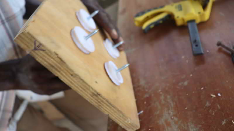We later made another frame loom from metal and nails through welding. The frame loom had a hollow space at the centre for easy weaving.