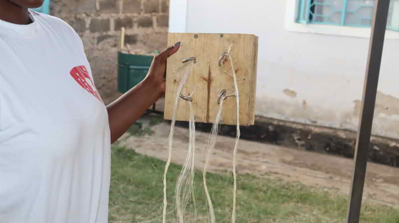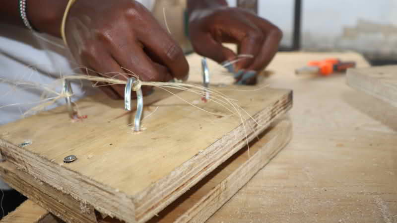 Sisal fibre trial by tying one end of the hooks with the sisal fibres to the other ends as well and using a drilling tool to help in spinning the fibre into a yarn.