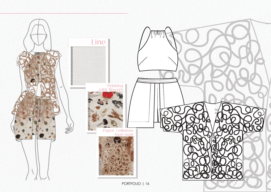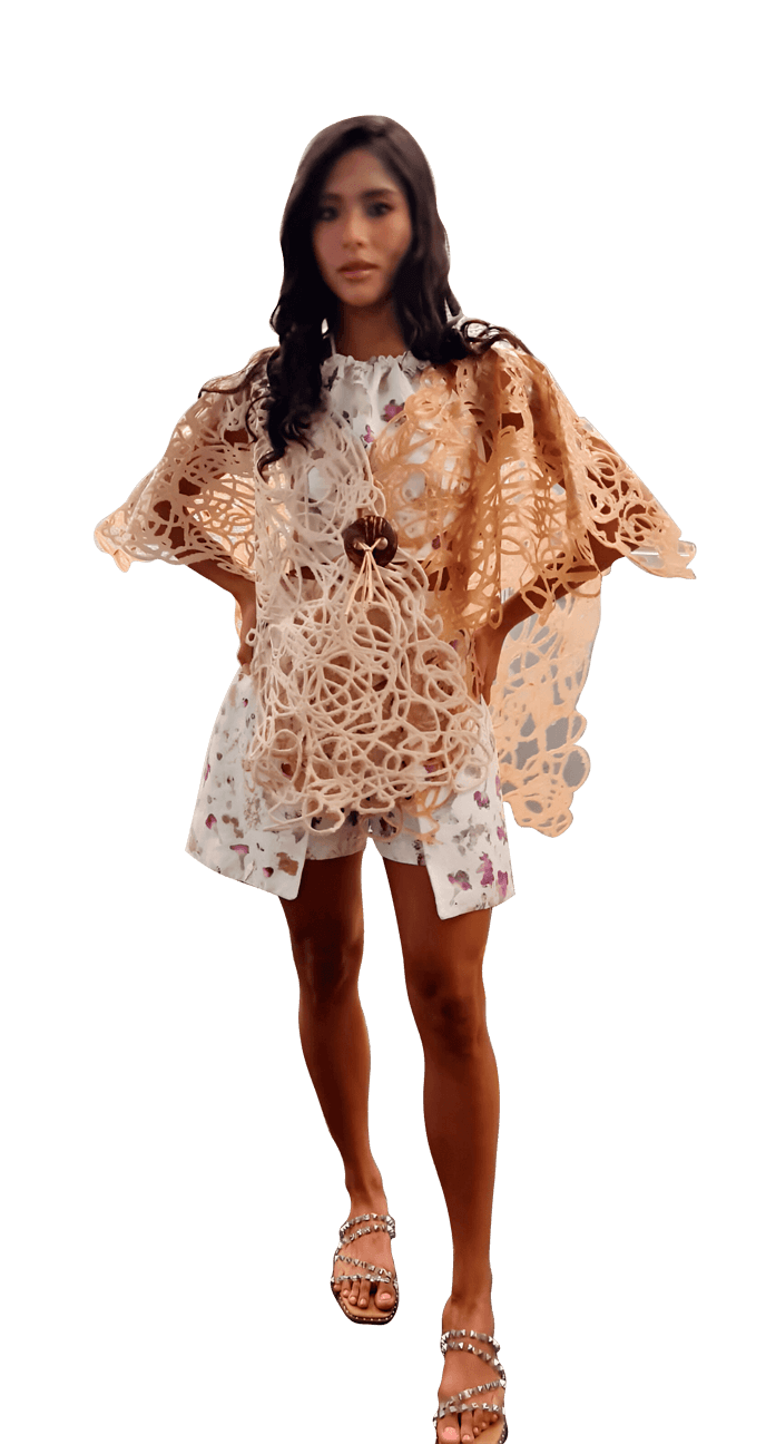 This project predominantly uses natural fibers and biomaterials created from scratch, supported by digital manufacturing.It consists of three pieces: a top and short skirt made of linen and a kimono made of cellulose paper and agar-agar. In collaboration with Alberto Blanco y Valeria Vega.