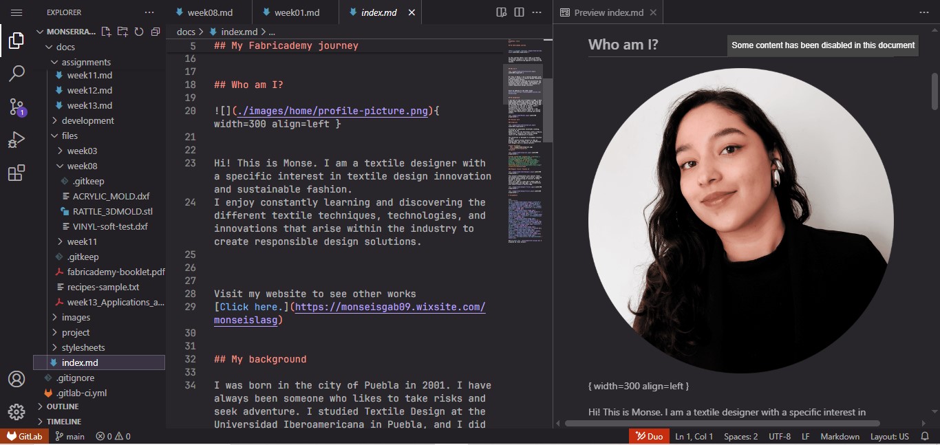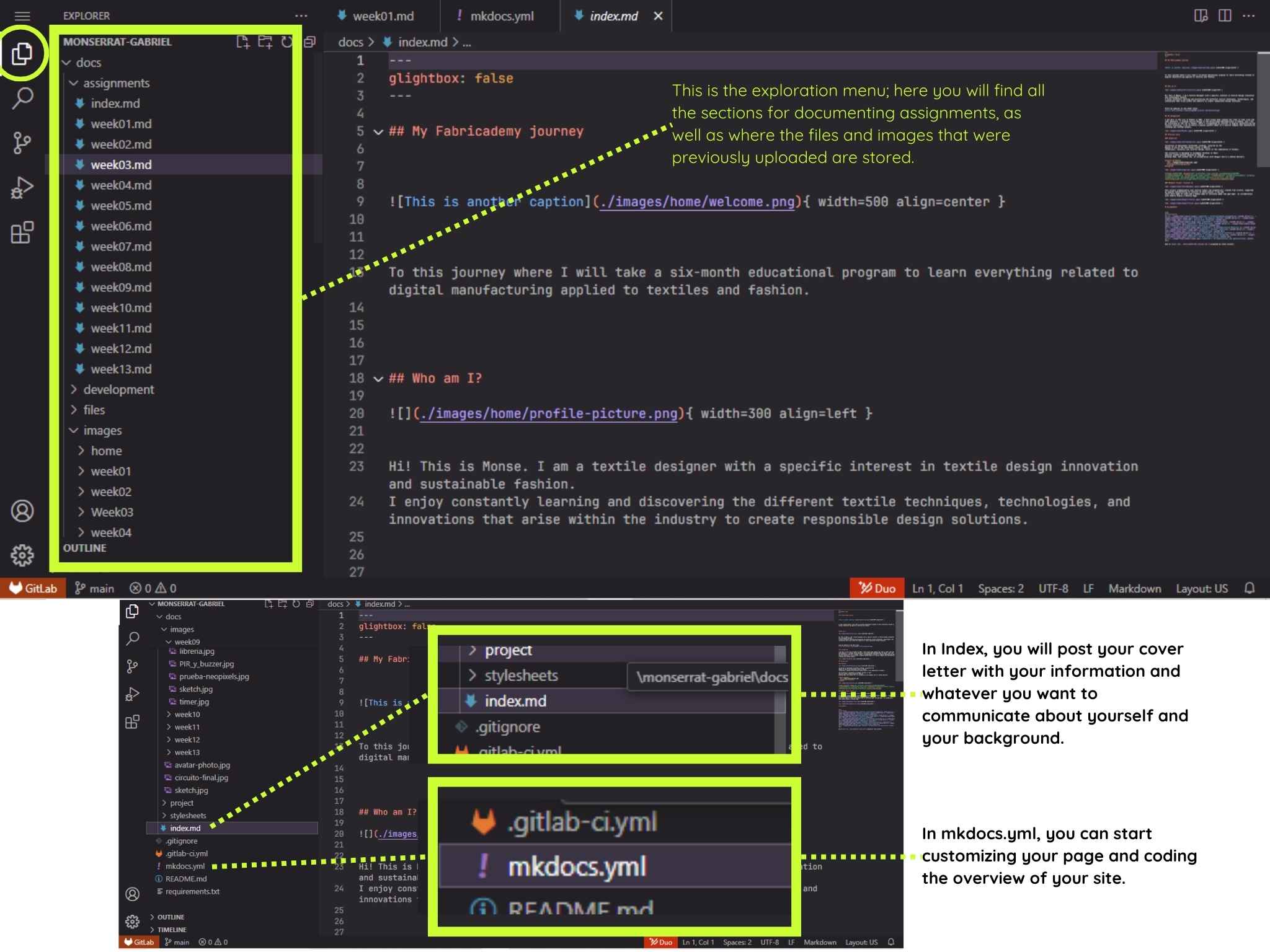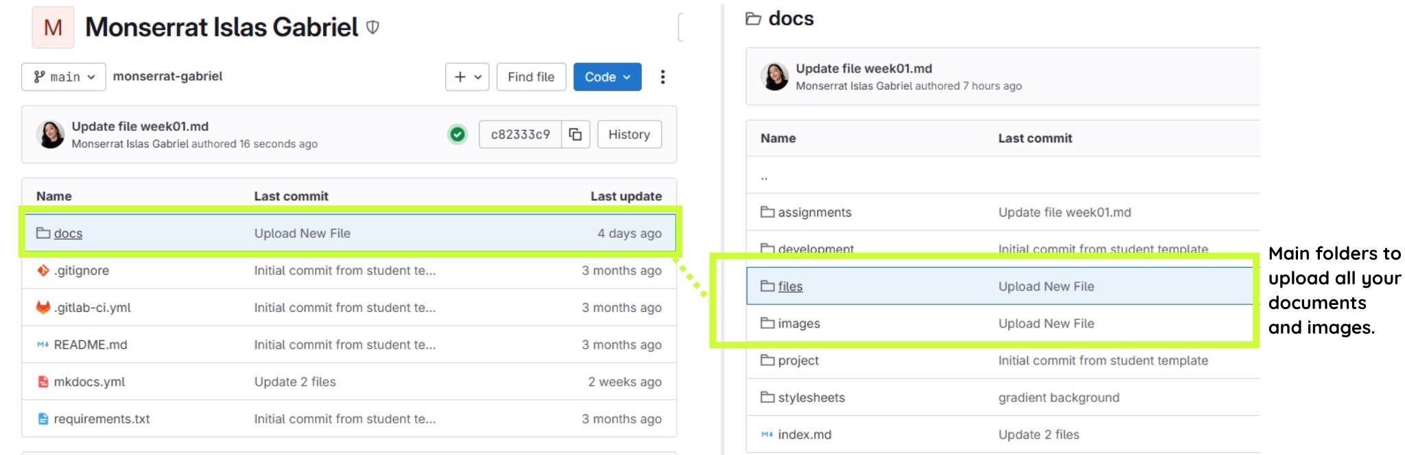 To start with the documentation it is important to know the GitLab platform and the menu, i was able to navigate over the functions and folders to upload images and files.