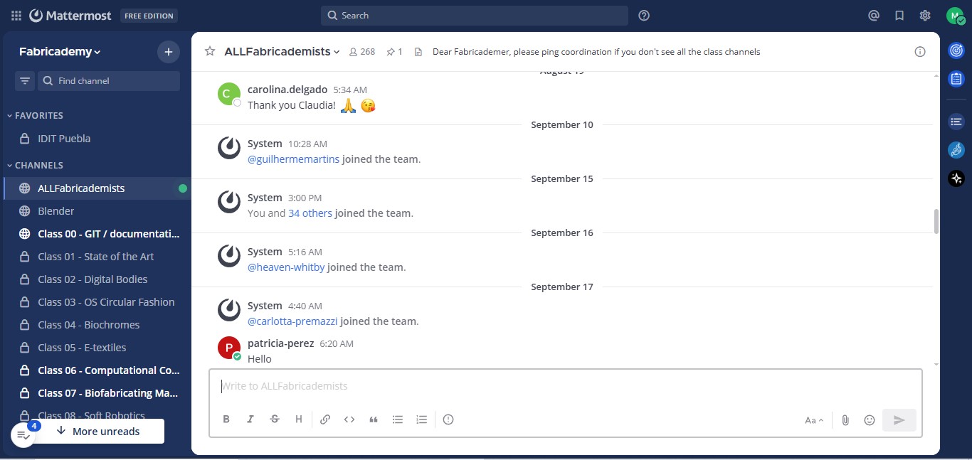 Mattermost will be fabricademy's central communication platform. As an international program, it will allow us to stay connected across the entire network, fostering a space for collaboration and community support among students, instructors, and mentors.