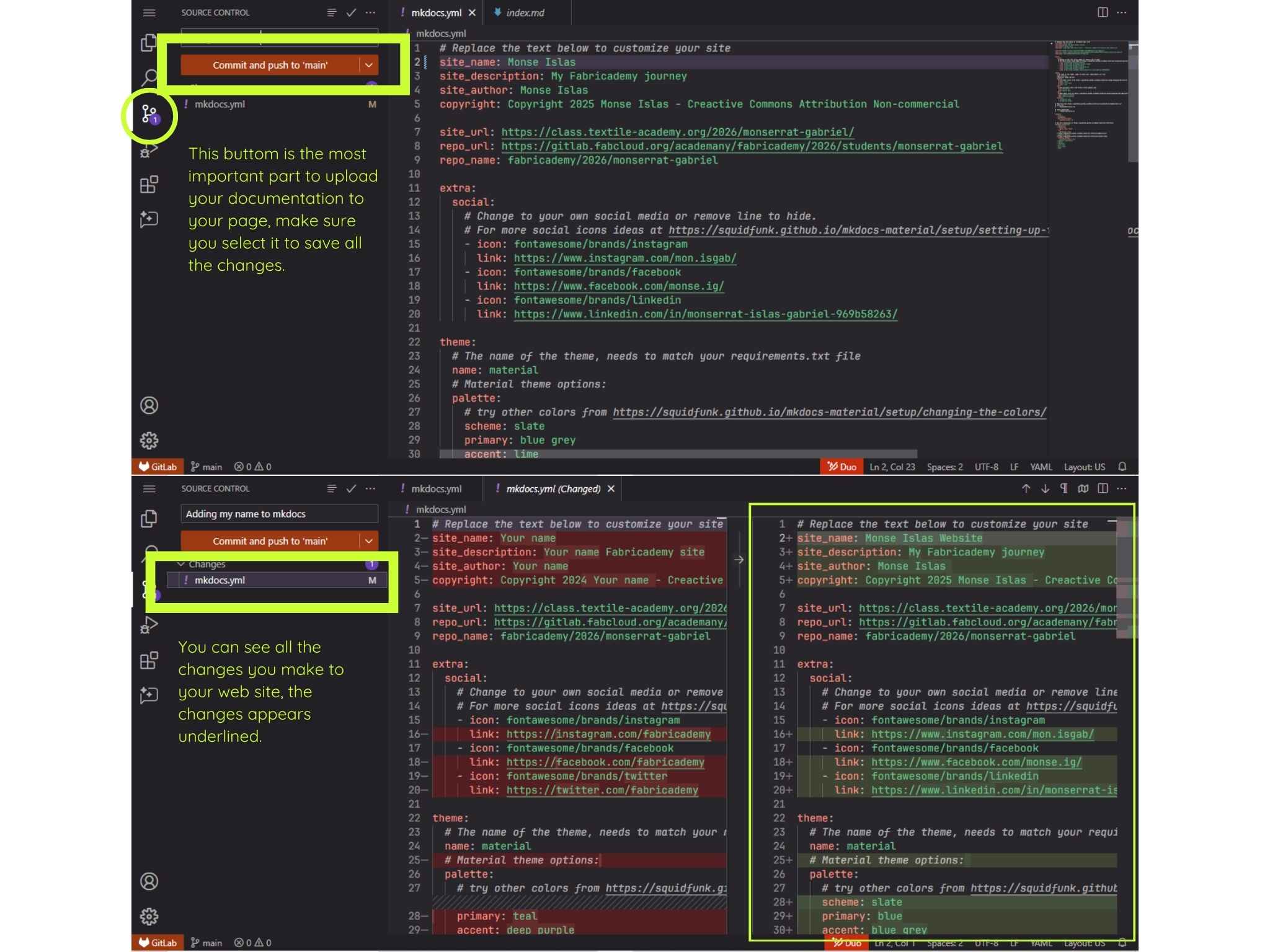 Once you push "commit" you can see the changes you made in the part bellow commit, and the changes appear in a differente color.