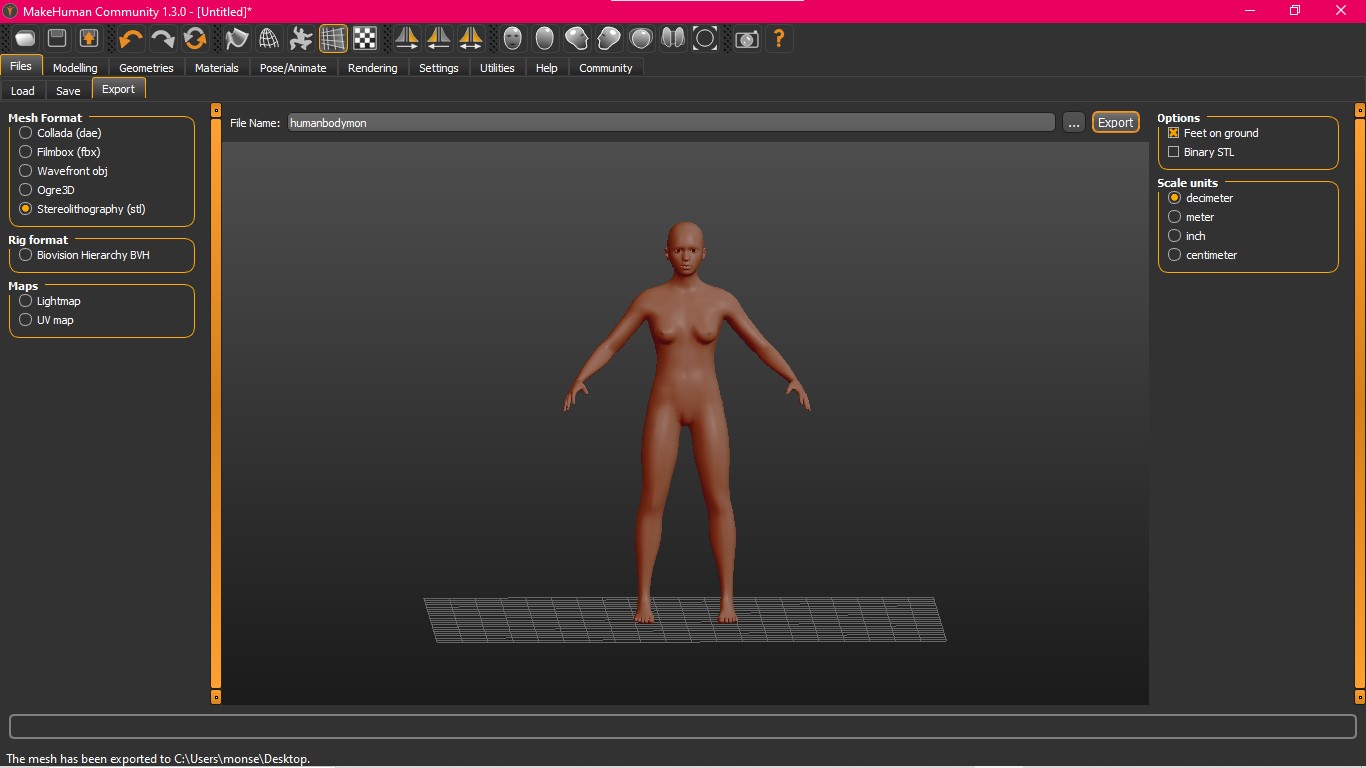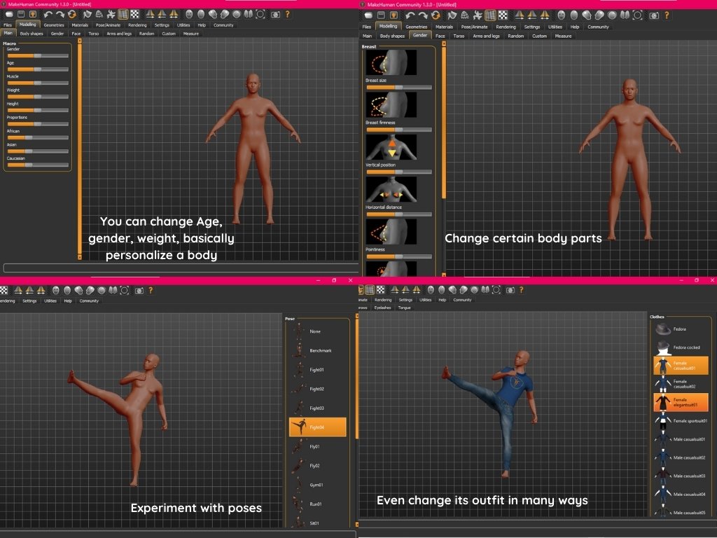 After this, I wanted to try out another tool for working with the human body and making different adaptations, so the Make Human app was ideal, as it is open-source software designed for creating digital models of the human body in a parametric way.