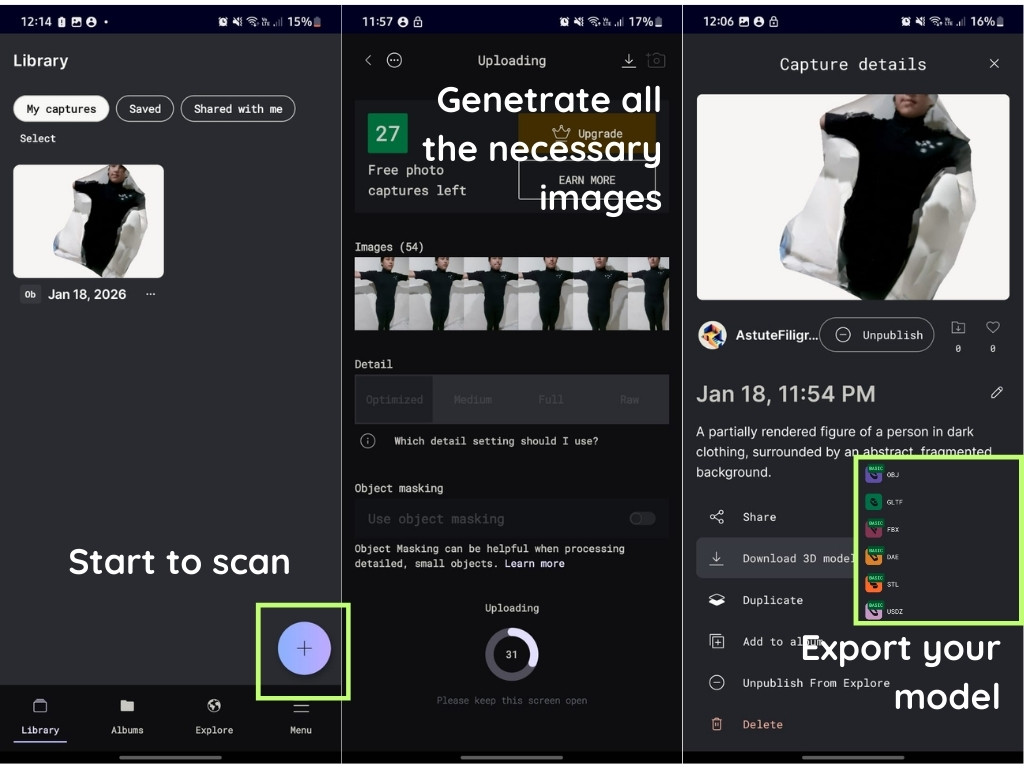 For the first part of the assignment, I decided to experiment with the Poly Cam mobile scanning app. I realized that it is a great option because it is fast, accessible, and accurate enough to work with the human body. One recommendation to keep in mind is that you need very good lighting, and the more photos you take of the object, the more realistic and detailed it will be. I took around 80-90 images to capture a full body.