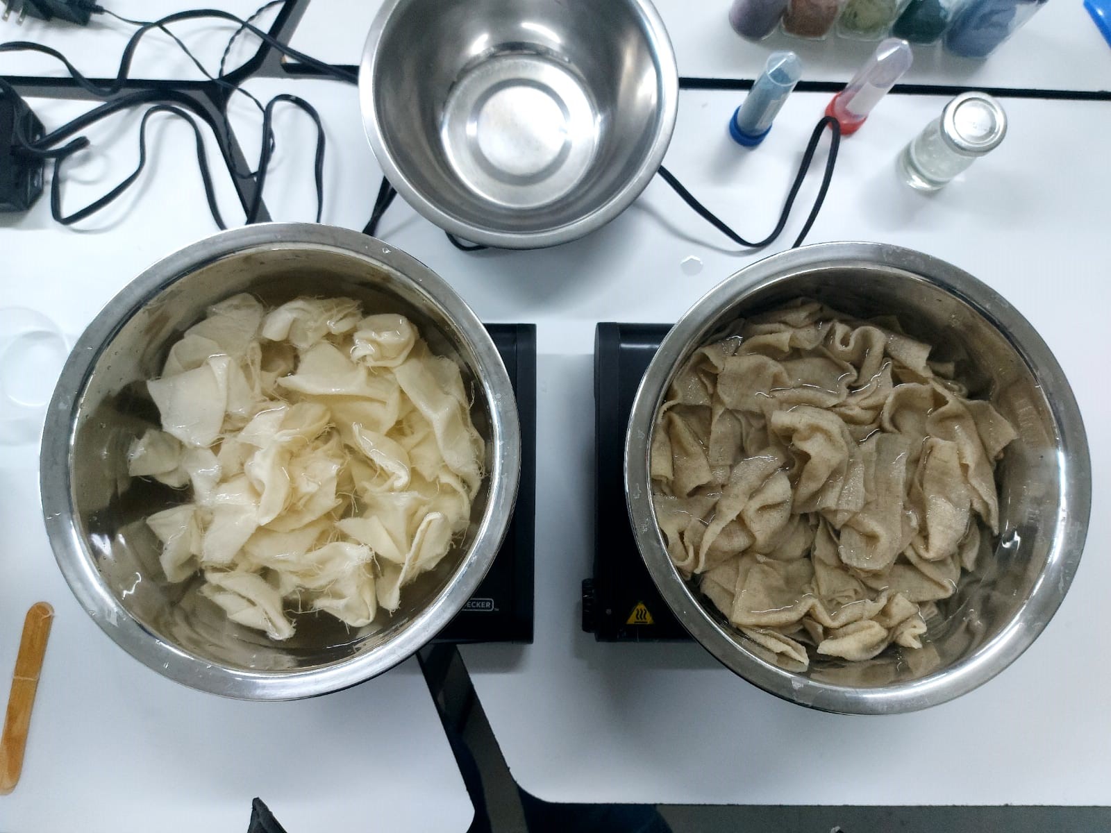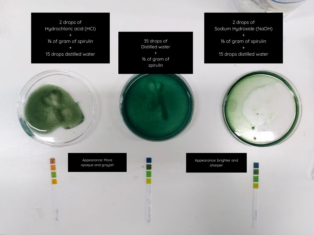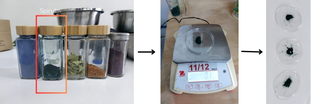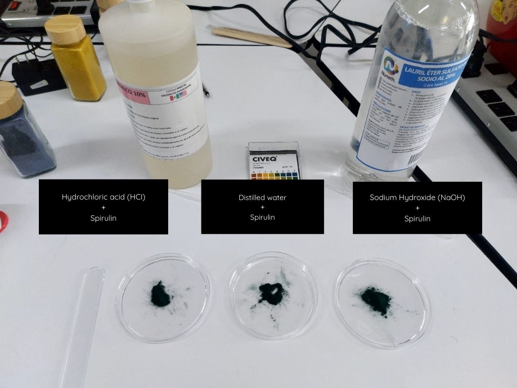For this first part, I tried with spiruline pigment to experiment with changing its color using modifiers, this pigment was already in the laboratory, so I just prepared the fabrics and made the solution to dye them, but not before seeing how this dye reacted with sodium hydroxide (NaOH) and hydrochloric acid (HCI).