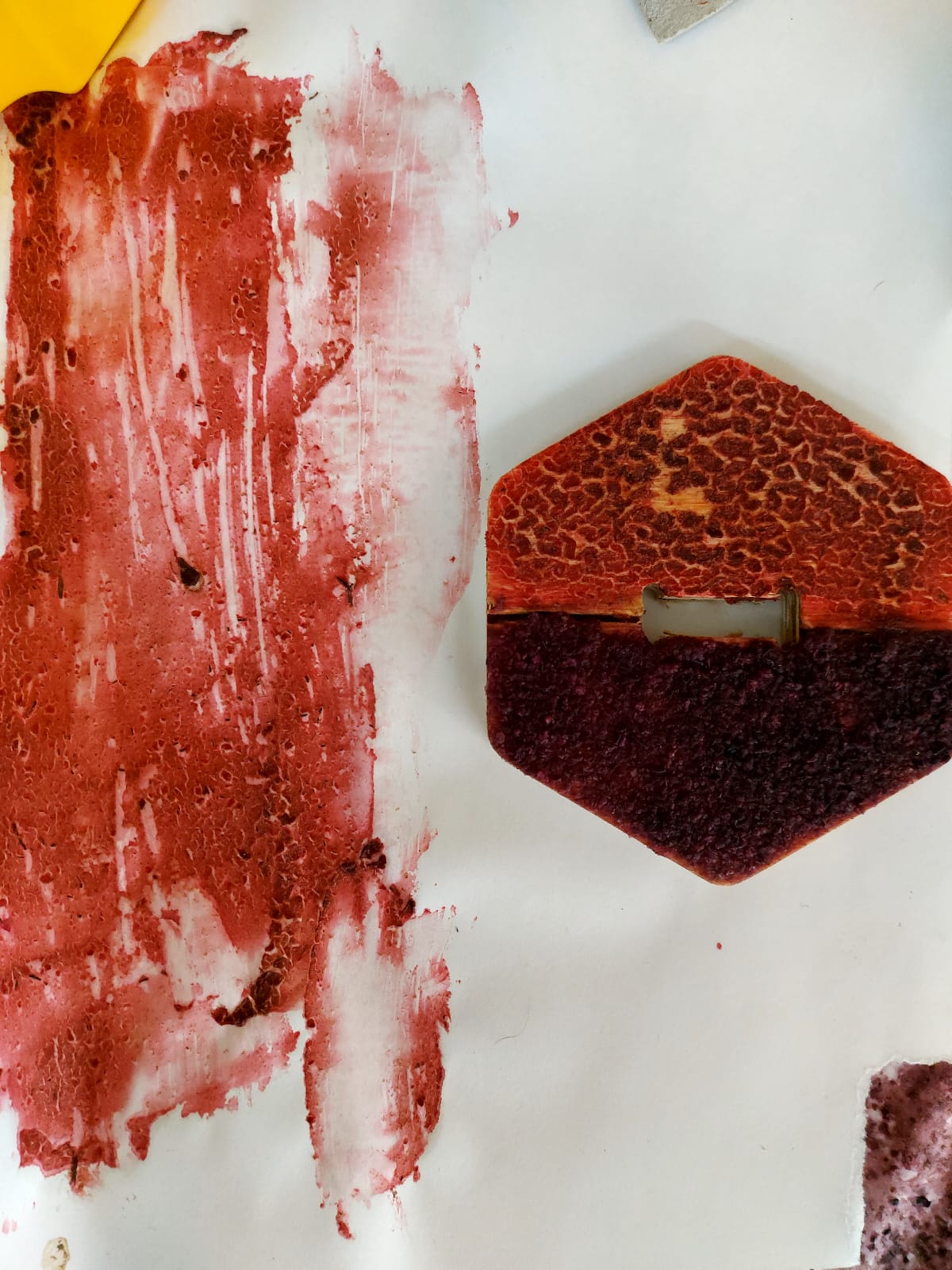 We tested it on a wooden base and on paper to see how it reacted differently. As you can see, during the drying process, the ink cracked only in some parts and the color changed from pink to a reddish orange.