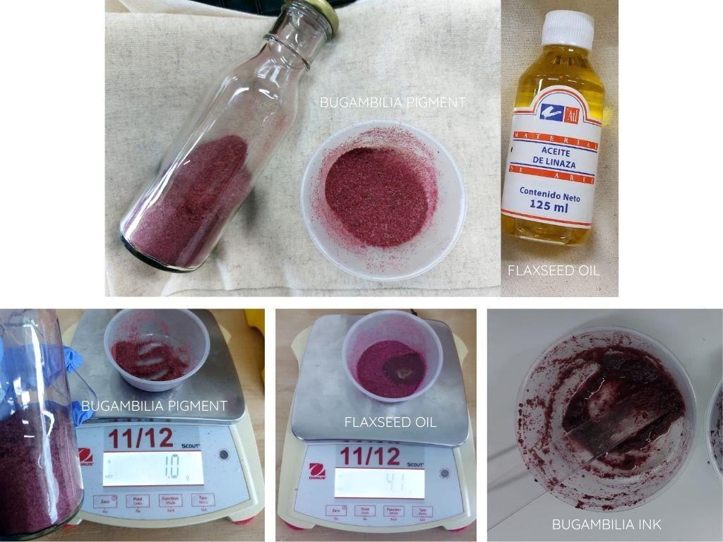 | Bugambilia | 1gr of bugambilia pigment, 4.1 gr of flaxseed oil | Mix all the ingredients until and keep stirring until you create an ink with a fairly thick consistency, then let it repose for 5 minutes. If you notice If you notice that it does not have the right consistency, you can add a little cornstarch to thicken it without losing its properties. |