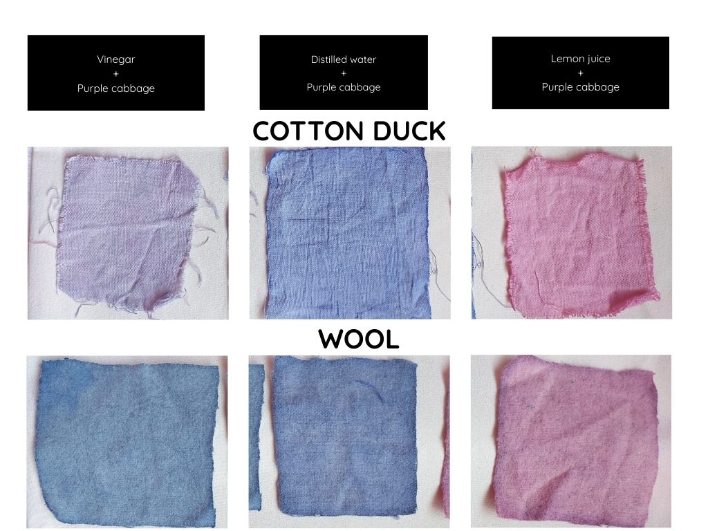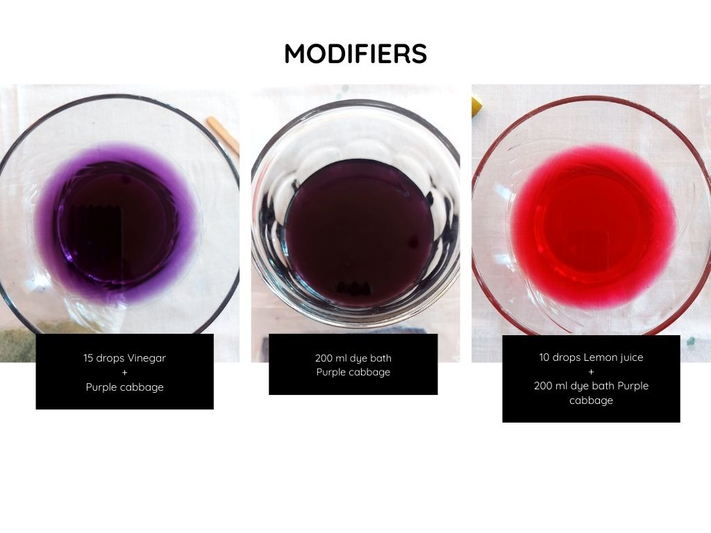 | COLOR 1 (lilac) MODIFIER 1 Vinegar | Cotton duck | 6.8 gr cotton fabric + 200 ml Purple cabbage dye bath + 15 drops of vinegar | While the dye bath is hot, pour in 15 drops of vinegar. You will automatically see the color change. Place the pre-mordanted and damp fabric (not wet) in the hot dye bath. As the color is easy to pigment, you can leave it to rest for 12 hours, but if you want a more intense color with greater fixation, you can leave it for 24 hours. Once you have obtained the desired color, remove it and rinse it with cold water until it stops releasing color. | It results into a soft lilac color |