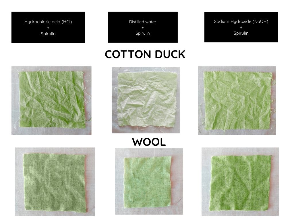 | COLOR 4 MODIFIER 1 Hydrochloric acid (HCI) | Wool | 1 gram spirulin pigment + 12.6 gr of wool fabric + 200 ml Distilled water + 20 drops of Sodium hydroxid(NaOH) | Put hot distilled water, not boiling in a bowl. Dissolve 1 gram of spirulina pigment. Immerse the pre-mordanted and damp fabric, not wet, in the hot dye bath. Let it sit for 24 hours and once the color is obtained, rinse with cold water until the extra dye get lost. | The color in this type of fabric is less bright, and the color adhesion has a more oxidized appearance. |
