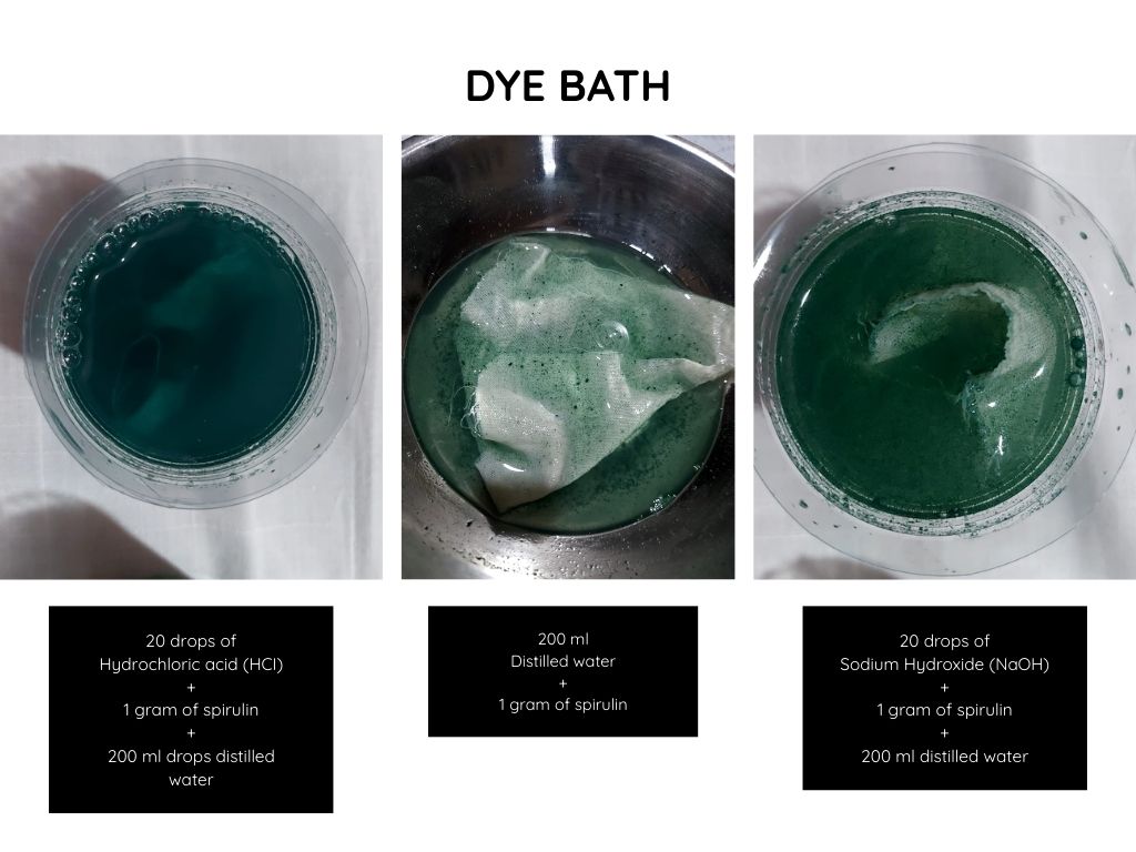 | Color 3 MODIFIER 2 Sodium hydroxid(NaOH) | Cotton duck | 1 gram spirulin pigment + 6.8 gr cotton fabric + 200 ml Distilled water + 20 drops of Sodium hydroxid(NaOH) | Put hot distilled water, not boiling in a bowl. Dissolve 1 gram of spirulina pigment. Immerse the pre-mordanted and damp fabric, not wet, in the hot dye bath. Let it sit for 24 hours and once the color is obtained, rinse with cold water. | The color is slightly brighter and greener, but the difference is not noticeable. |