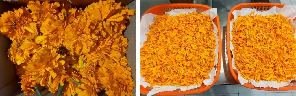 To obtain my pigment, I decided to collect all the leftover flowers from the Day of the Dead celebrations that we traditionally hold in Mexico during the month of November. I think it's a good way to use the flowers before they completely dry out and their color is affected by oxidation over time.