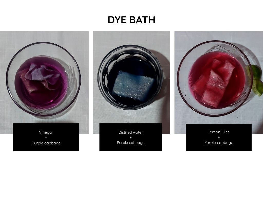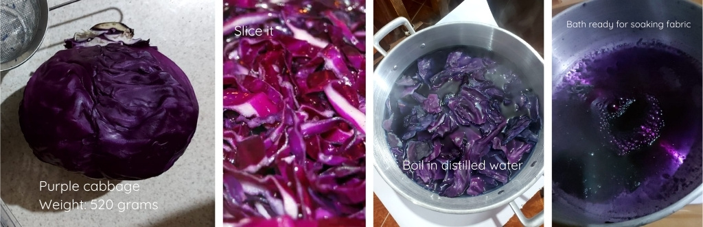 | Purple cabbage | 520 grams of purple cabbage, 1.5 Lt of distilled water | Boil pieces of cabbage in water for about 30 minutes to create a violet dye, then strain the liquid and it is ready to dye. |