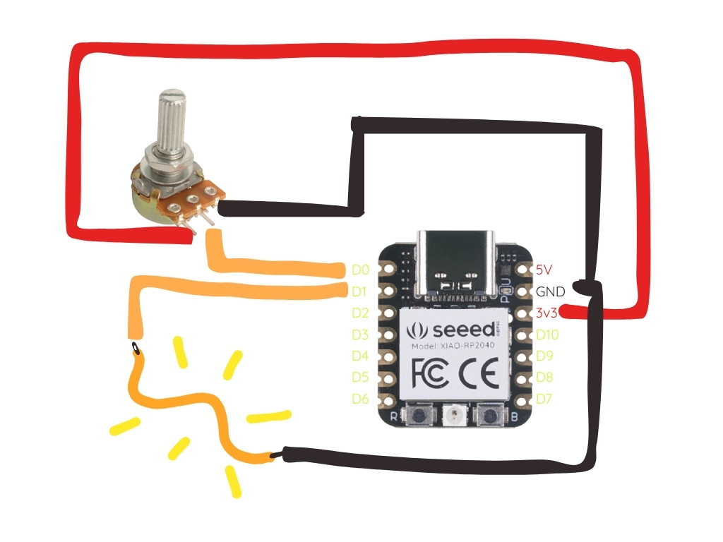 To increase the difficulty and getting familiar with arduino, I tried with a potenciometer and a noodle LED to control the intensity of the LED