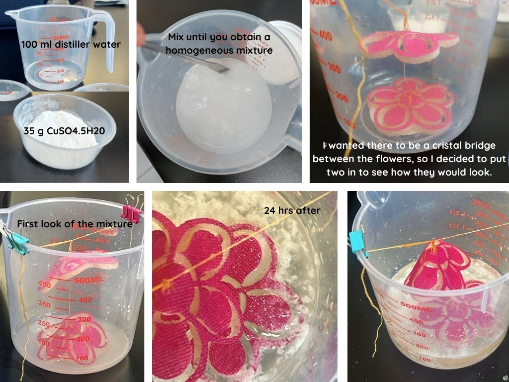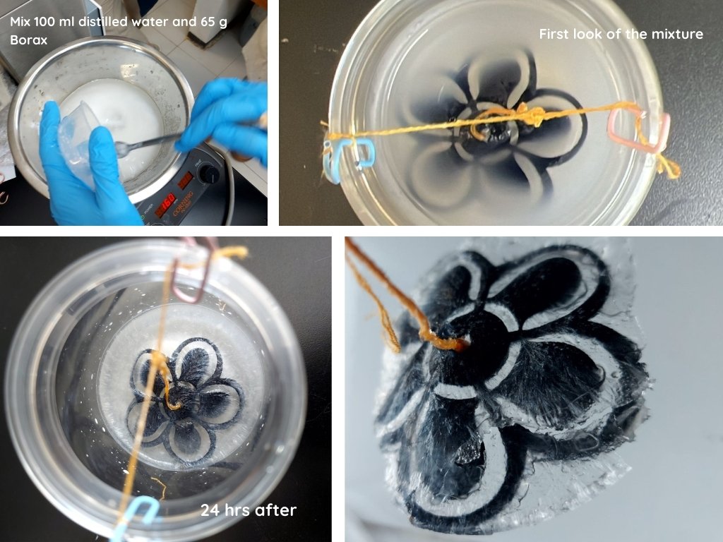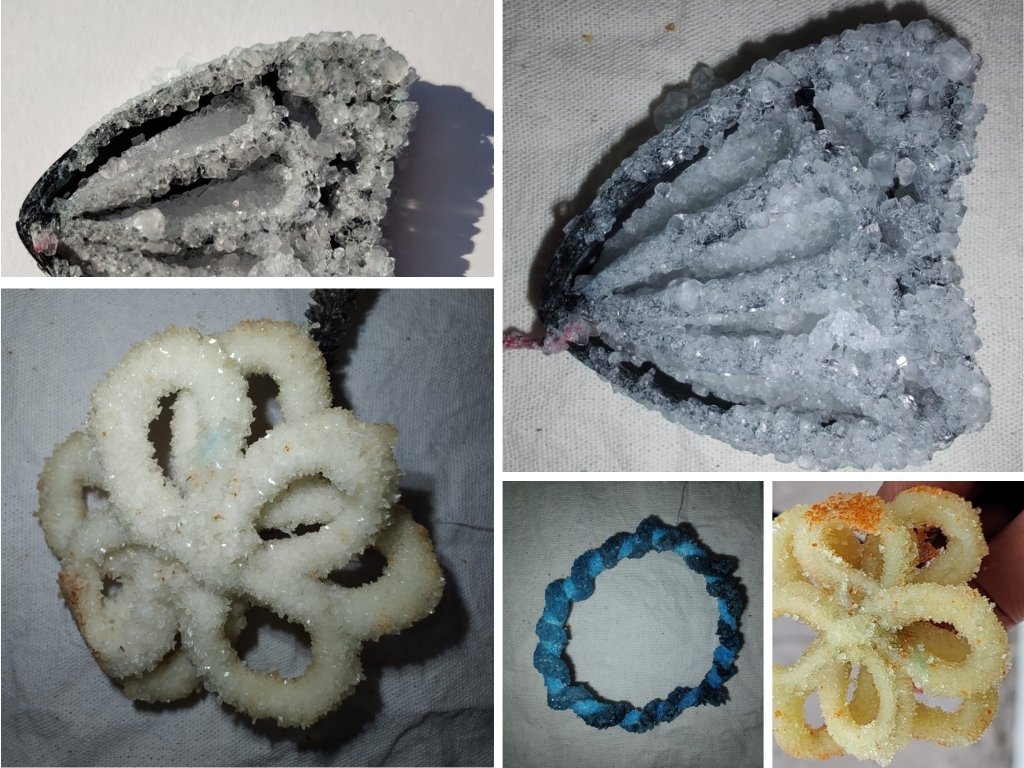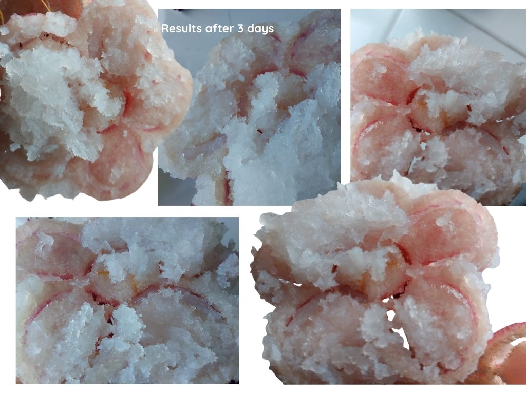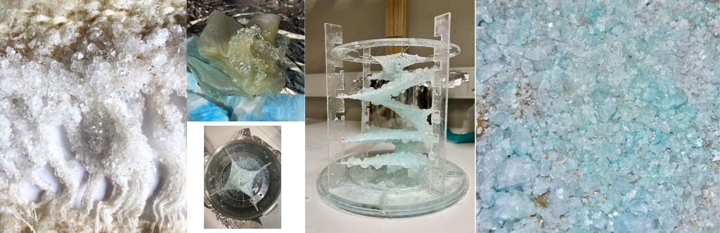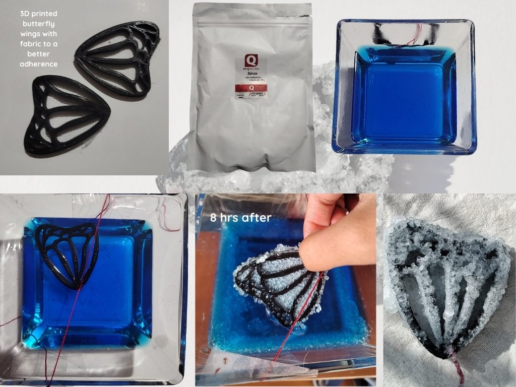 For the crystallization technique, I used Ahinoa's work as a reference, as I was able to see the different growth reactions of crystals with different components, such as alum, borax, and sulfate, creating different crystal shapes and surfaces. So, I also experimented with some different ones and changes in the recipes to see what would happen.