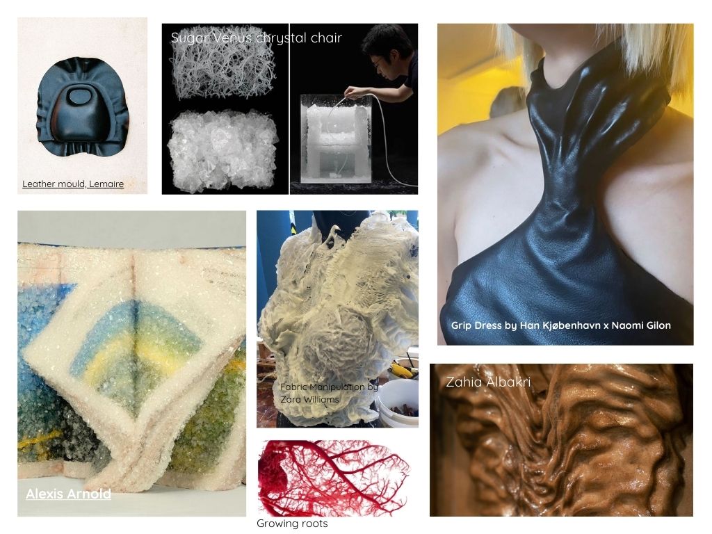 In fashion and design, we can use techniques such as fabric formwork with casting, crystallization, wood-textile composites, resin and bioresin textile composites, leather molding, among others. For this assignment, we will focus on crystallization and leather molding.
