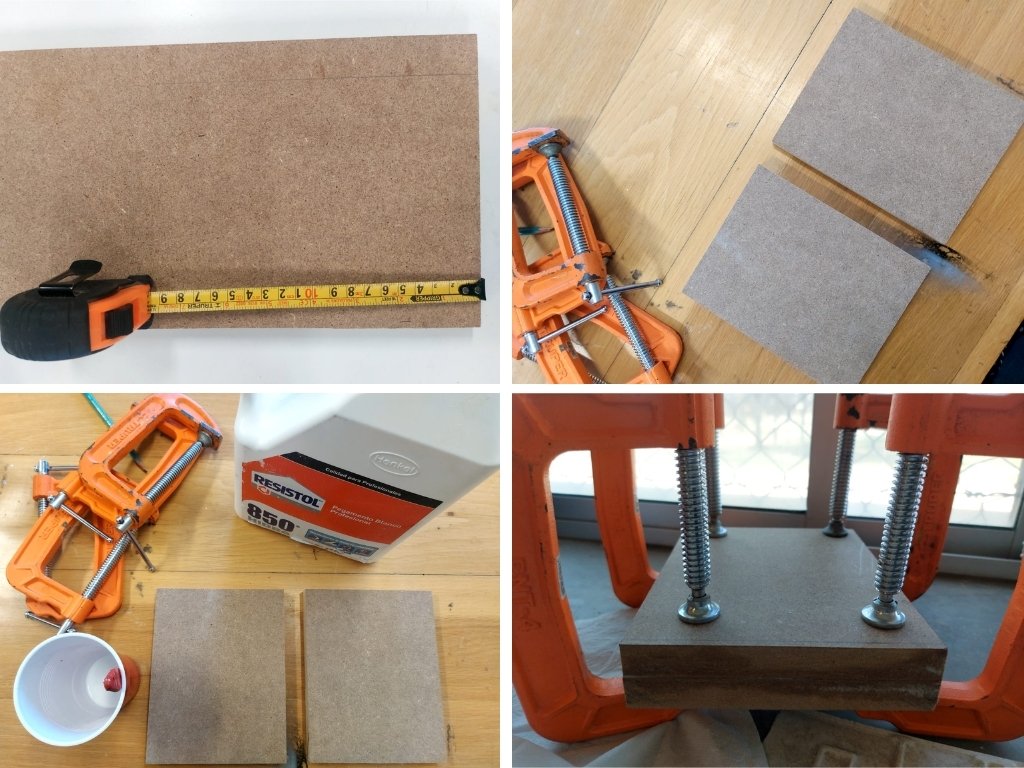 First, I cut two MDF boards to make my mold, since the thickness must be double for the figure to be extruded. So, I glued one on top of the other and let it dry with some presses to apply pressure until it was firm and ready.