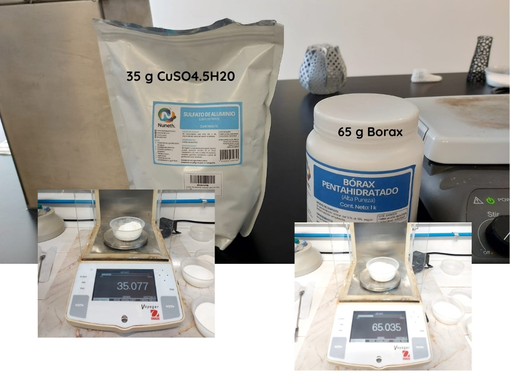 For crystallization, we used cupric acid and borax pentahydrate as a first attempt; however, the borax was difficult to handle as it solidified very quickly.